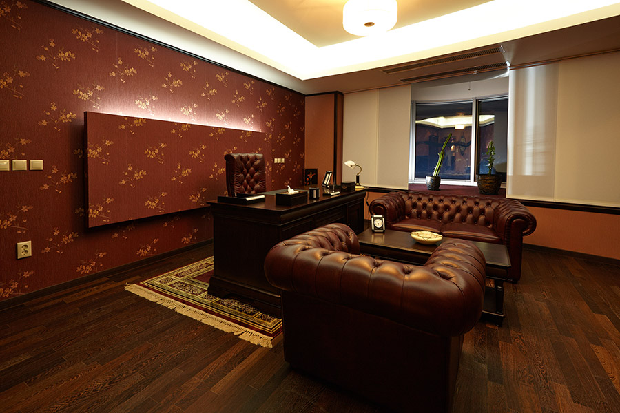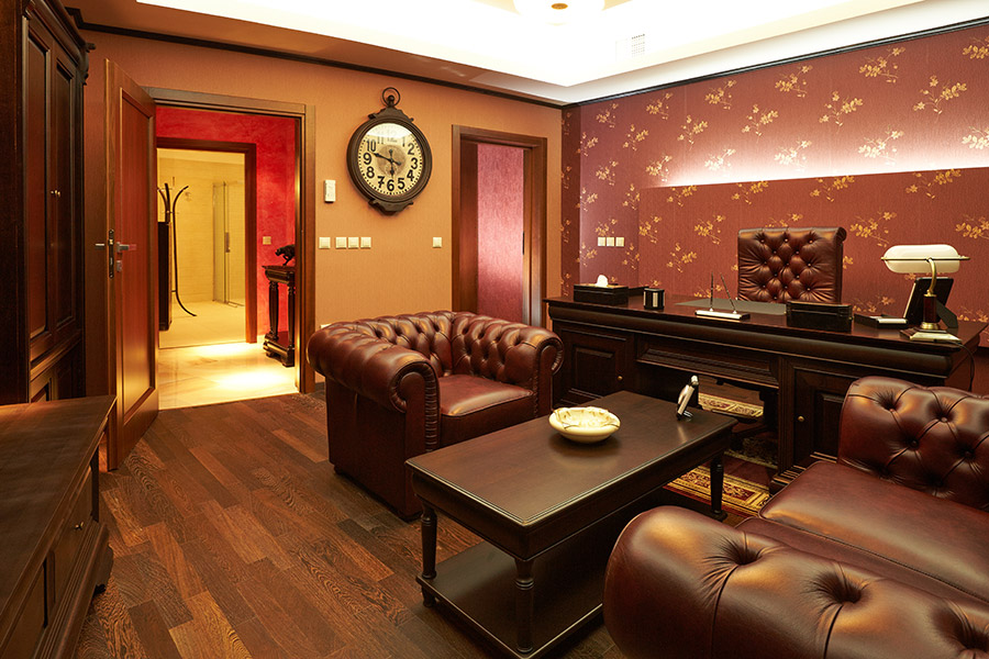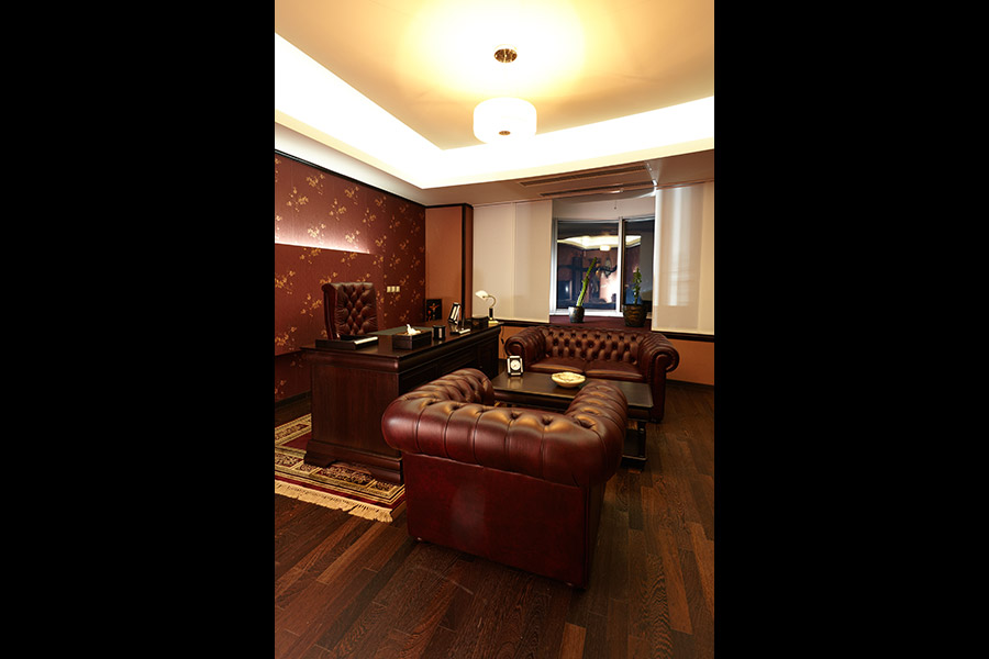 Masa de lucru este din lemn masiv, iar fotoliile asezate fata-n fata sunt din piele naturala.
